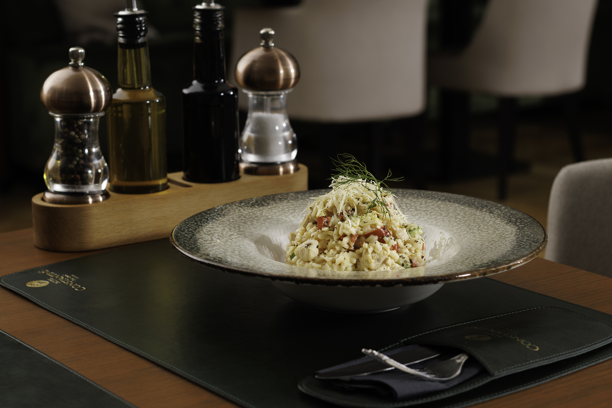 Jelovnik kombinuje internacionalnu i domaću kuhinju, pripremljenu od svežih sastojaka i sa dozom kreativnosti naših kuvara. Dostupni su à la carte specijaliteti, kao i švedski sto za doručak.